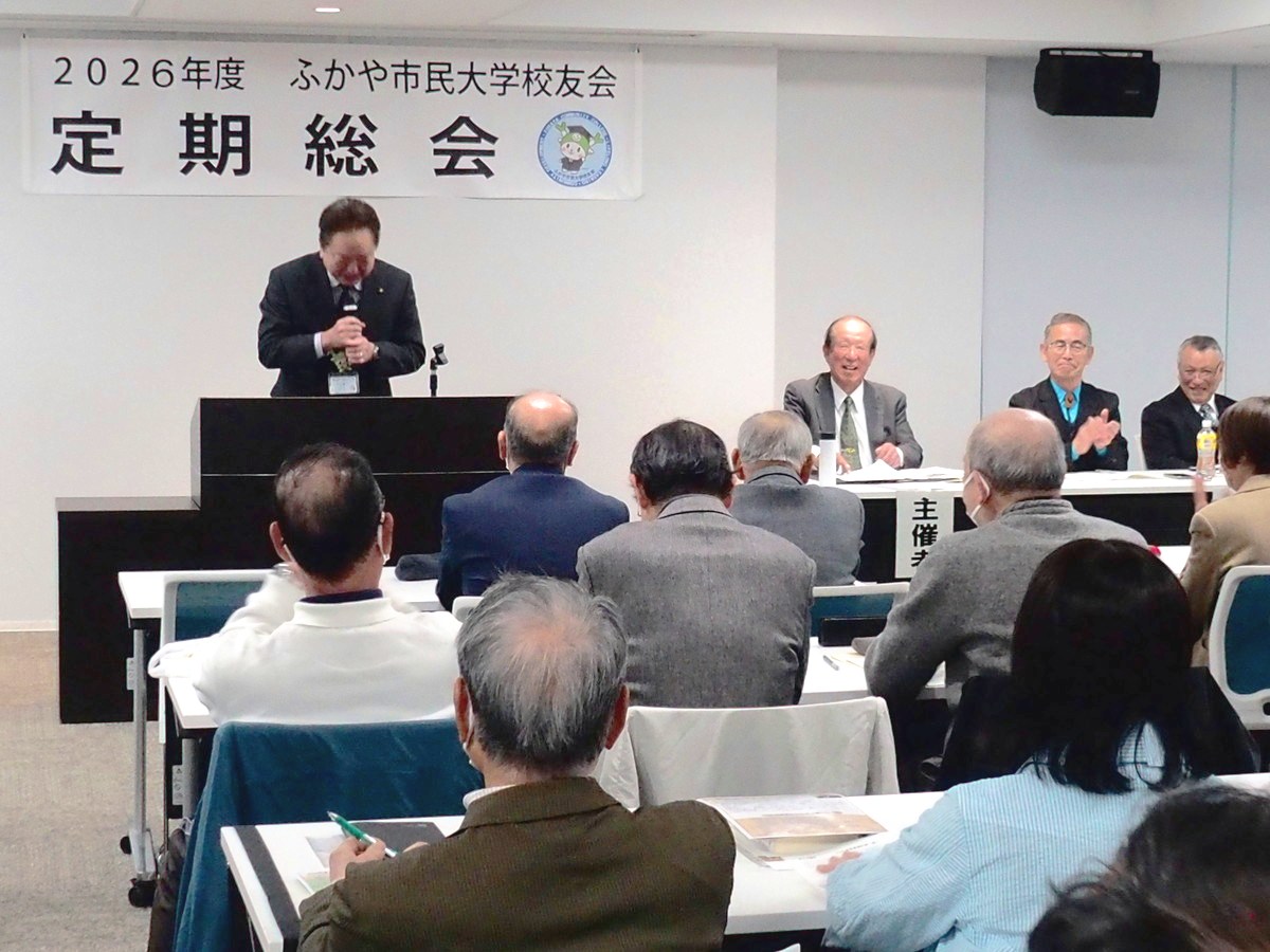 来賓としてお越しいただいた、深谷市長・小島進 様、深谷市地域振興財団 理事長・坂田秋雄 様、こくみん共済coop熊谷支所 支所長・伊藤整 様 からのご挨拶を戴きました。続いて、野元会長が議長となり、第1号議案「2025年度事業報告」、第2号議案「2025年度会計収支報告、監査報告」、第3号議案「2026年度事業計画(案)」、第4号議案「2026年度予算(案)」、第5号議案「2026年度役員体制(案)」について審議が行われました。今後の校友会活動について、幾つかの提言や提案がなされましたが、議案書の数か所の文言修正を経て、全議案共に大多数賛同がなされ可決されました。