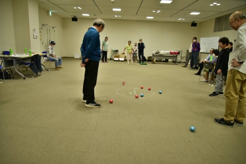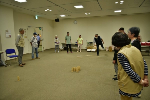 レク委員の提案による従来ゲーム3種目(紙ヒコーキ飛ばし、新聞紙玉入れ、ペタカーリング)と、新ゲームとしてモルック(12本あるピン目がけて木製の棒を投げピンの倒れ方で採点する軽スポーツ)を取り入れ、4種目を4チームで競い合い楽しい時間を過しました。慣れたゲームでも気持ちは昂ぶり声は自然と大きくなり、新ゲームモルックは想像以上に盛り上りました。