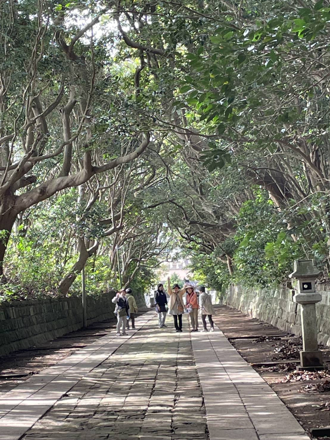 参道約300mの両側には樹齢300年を超えるヤブツバキやタブノキが密生している。