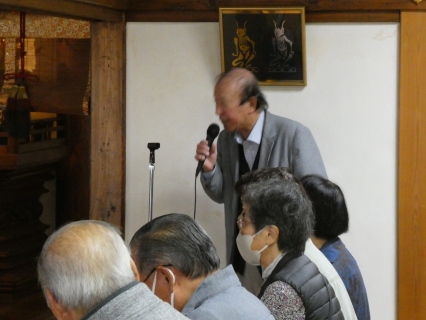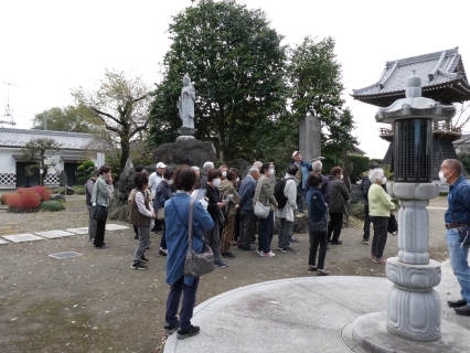 10時30分頃に住職の講話が終了してから、2手に分かれて、吉祥寺+桃井可堂郷土資料館の27名は引き続き瀧川住職の仏具等の説明を聞きました。吉祥寺のみの27名は木村講師の説明にて屋外の諸々の施設を見学しました。