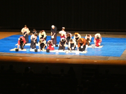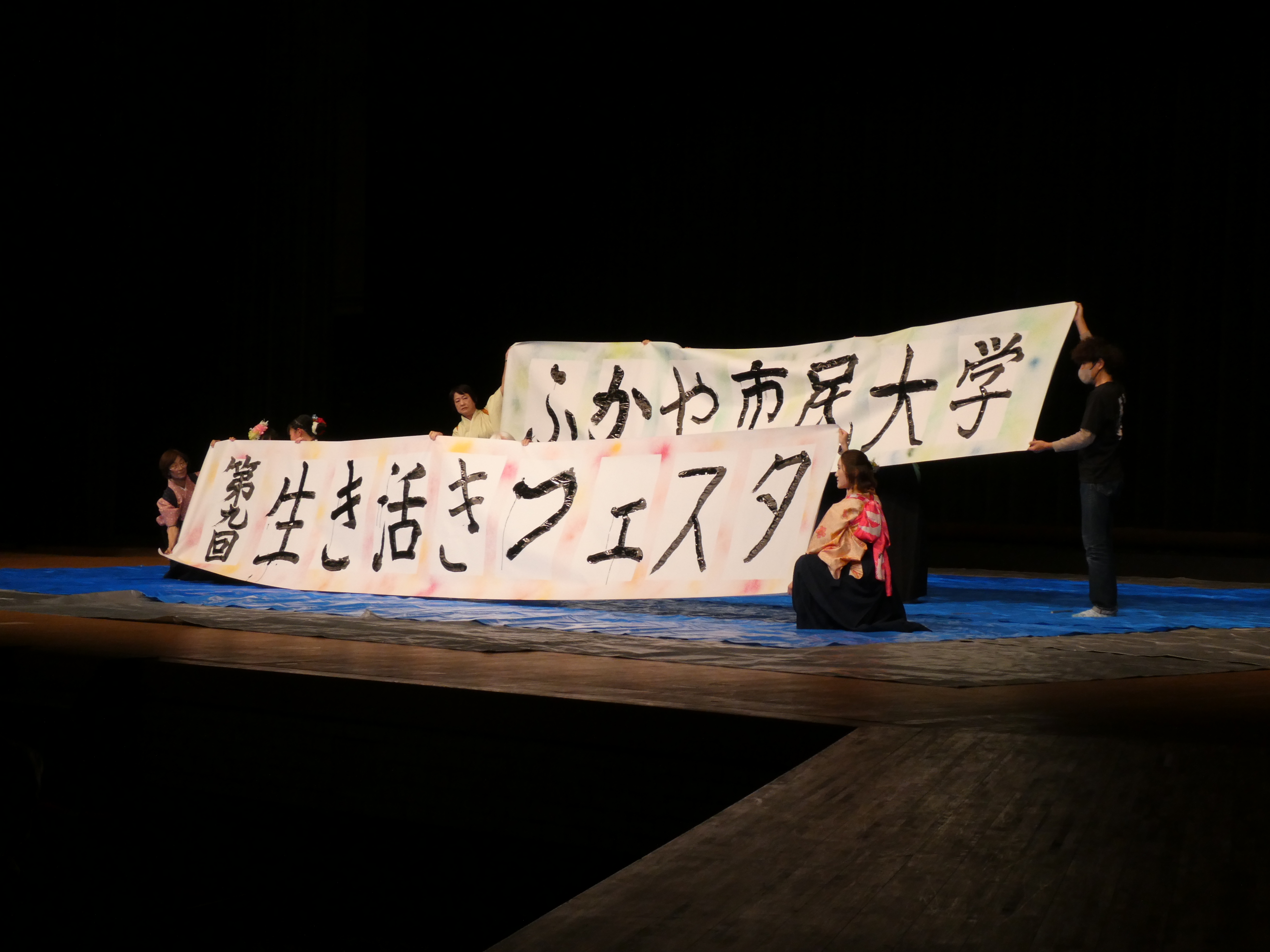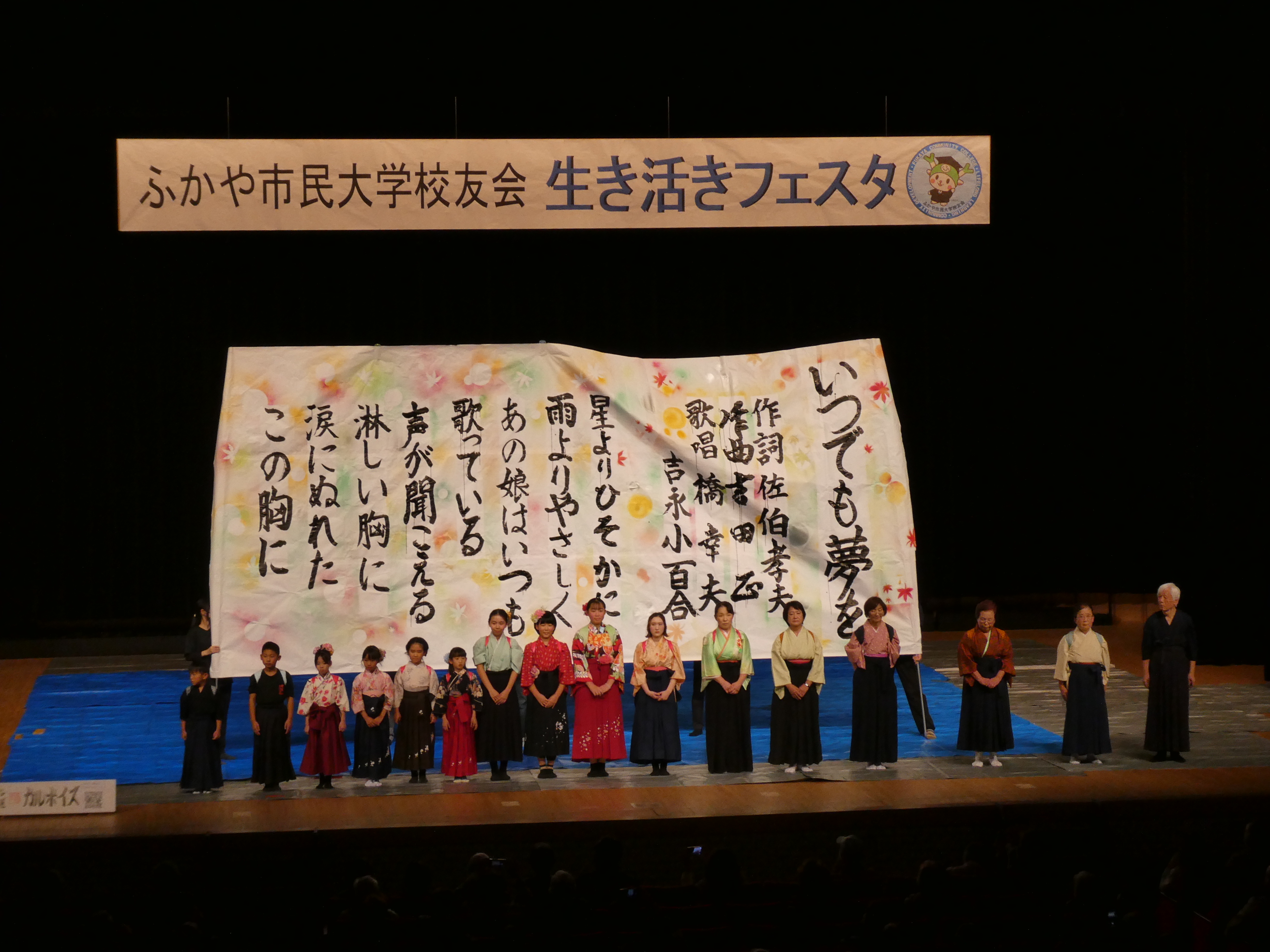 幡羅中学校音楽部のコーラスの後は、深谷書道ガルボイズによる書道パフォーマンス。小学生から80歳代の方まで参加しています。