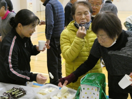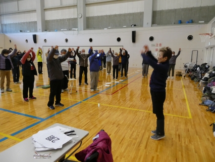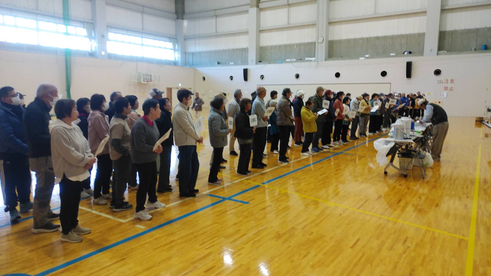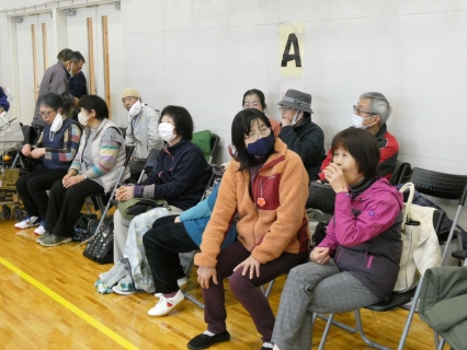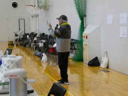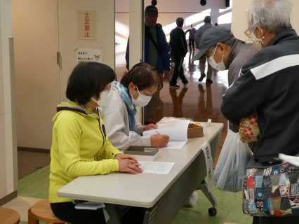 集合は9時でしたが、8時半頃から会場の上柴公民館体育室に参加者が集まり始め、体育室の入口前で受付しました。